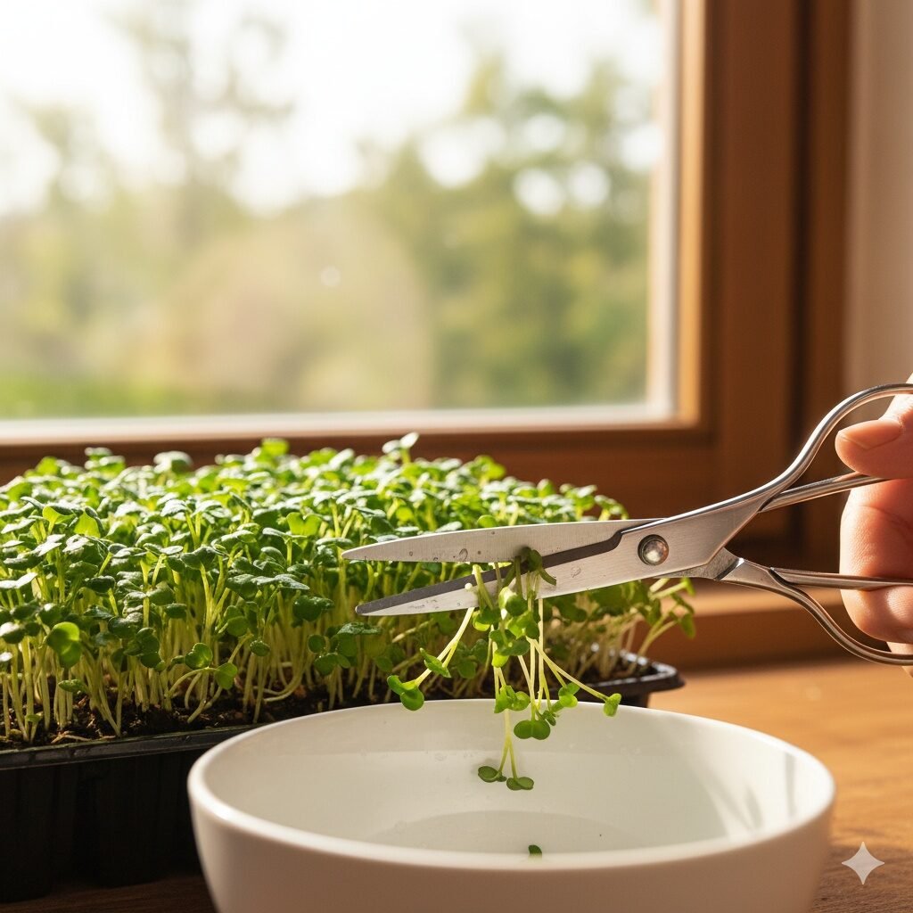 When your microgreens are about 2–3 inches tall and have those tiny leafy tops (usually in 7–14 days), snip them just above the soil line with scissors. Give them a quick rinse and enjoy.